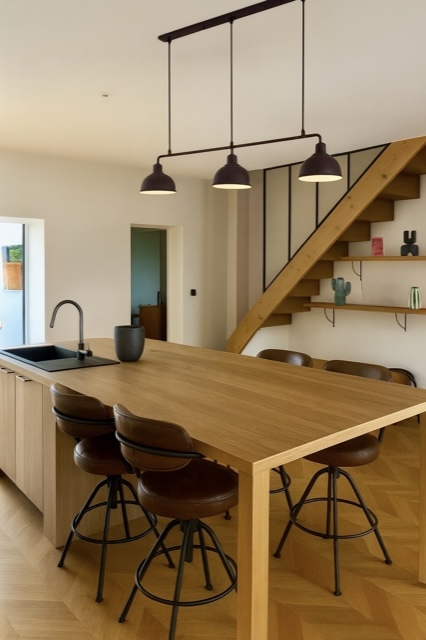 Dans cette maison située aux portes de Lille, tout a été réinventé. Le jeune couple rêvait d’un intérieur contemporain au caractère industriel, avec une grande pièce de vie ouverte pour recevoir autour de la cuisine. J’ai repensé l’espace et la décoration dans leur intégralité, afin de créer un lieu chaleureux et fonctionnel, fidèle à leurs envies.